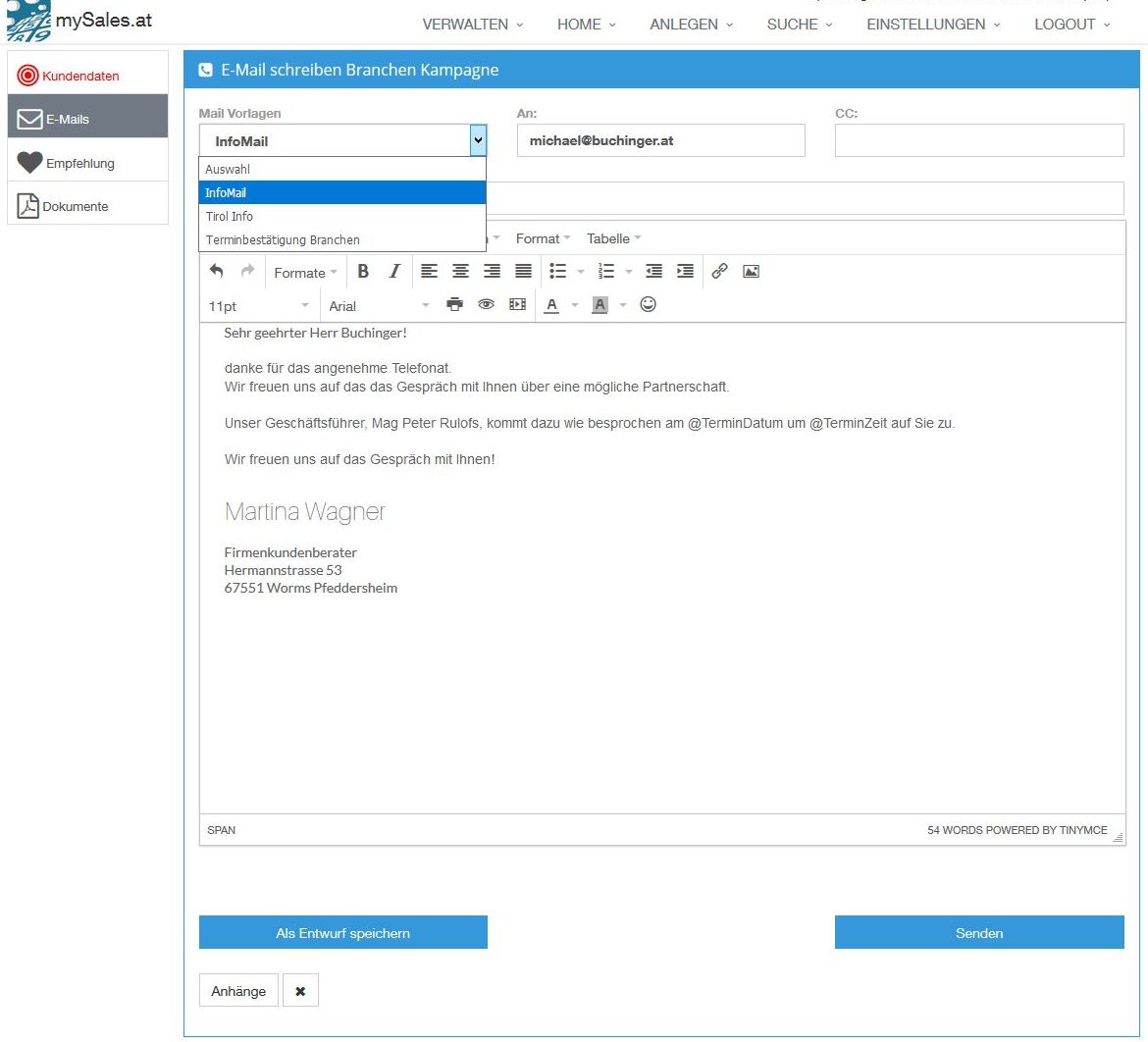 Nichts ist wichtiger, als regelmäßig mit Ihren Interessenten in Kontakt zu bleiben. Unsere E-Mail-Funktion unterstützt Sie mit Mailvorlagen, um effizient mit Ihren Kontakten kommunizieren zu können.