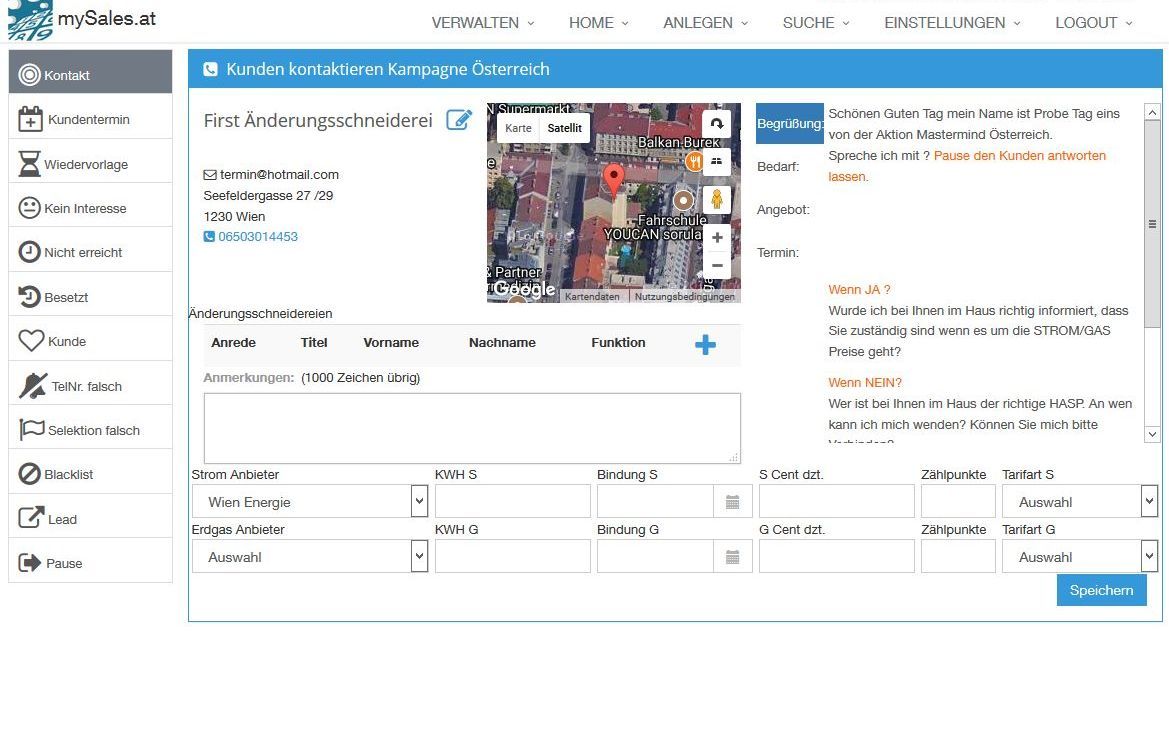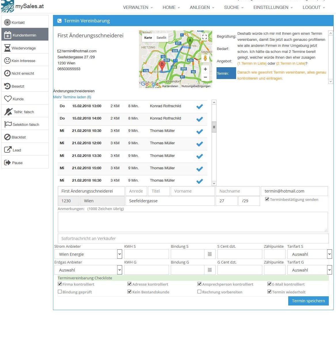Für Callcenter eignet sich MySales ganz besonders, um neue Kunden für Terminvereinbarungen zu gewinnen. Sie können Ihren Kunden eine einzigartige, routenoptimierte Terminvereinbarung anbieten und als zusätzlichen Mehrwert eine komplette Vertriebssteuerung. Dadurch binden Sie Ihre Kunden an Ihr Unternehmen. Zusätzlich telefonieren Ihre Agents per automatischer Anwahl über unsere Leitungen zu besonders günstigen Großhandelspreisen. Zur Qualitätskontrolle können alle Gespräche aufgezeichnet werden. Sie erhalten MySales als White Label Lösung mit eigener Domäne und eigenem Logo.